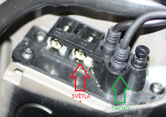 ② Rozpojte konektor mezi jednotkou motoru a senzorem tachometru (na obrázku označen zelenou šipkou). Povolte šroub na kladné (+) svorce světel (na obrázku označen červenou šipkou).