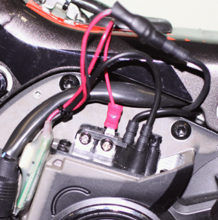 ③ Senzor tachometru připojte k PearTune a PearTune připojte k motoru pomocí odpovídajících konektorů. Červený napájecí kabel připojte na kladnou svorku světel. Utáhněte šroub této svorky.
